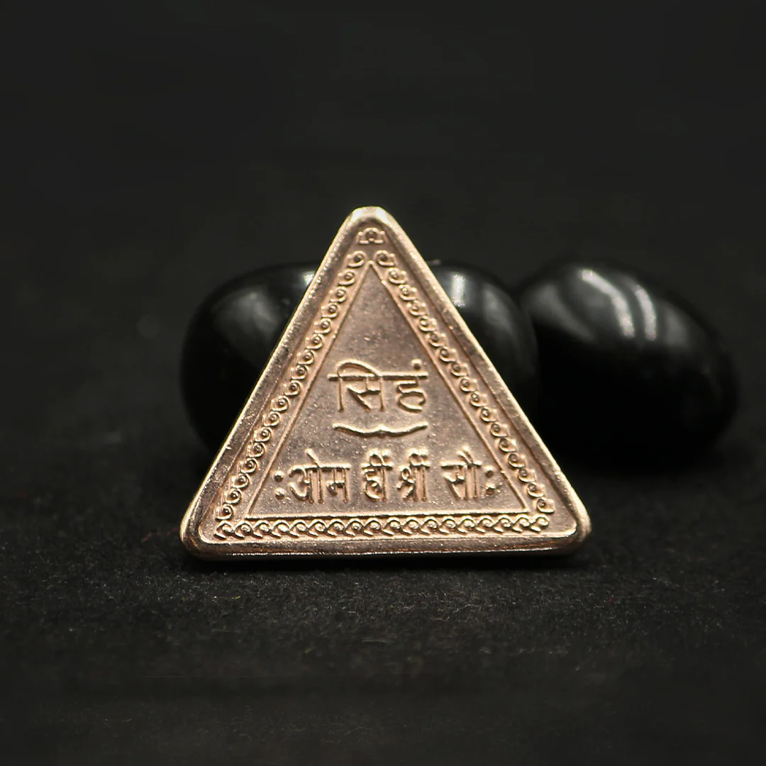 Singh Rashi Yantra Discover the power of the Singh Rashi Yantra, crafted from Copper and Rose Gold in the shape of a triangle coin, available with or without Kunda. Specifically designed for individuals born under the Leo sun sign, this yantra enhances health, emotional well-being, and personal happiness. Key Benefits: 1. Improve Health: Assists in treating issues related to teeth, head, throat, and stomach, promoting overall vitality. 2. Manage Stress: Helps alleviate mental stress, depression, and anger, fostering emotional balance. 3. Enhance Personal Happiness: Supports family happiness and the well-being of children. Craftsmanship Each Singh Rashi Yantra is meticulously designed, combining the strength of Copper with the elegance of Rose Gold. Its triangular form symbolizes Leo’s energy and courage, making it both a powerful talisman and a beautiful piece to own. Placement To maximize its benefits, wear the yantra as a pendant or keep it close in your pocket. It can also be placed on a personal altar to boost its positive energy. Conclusion Incorporate the Singh Rashi Yantra into your life to enhance health, relieve stress, and bring happiness to your family. With its superior craftsmanship and potent energy, this yantra empowers you to live with strength, balance, and joy.