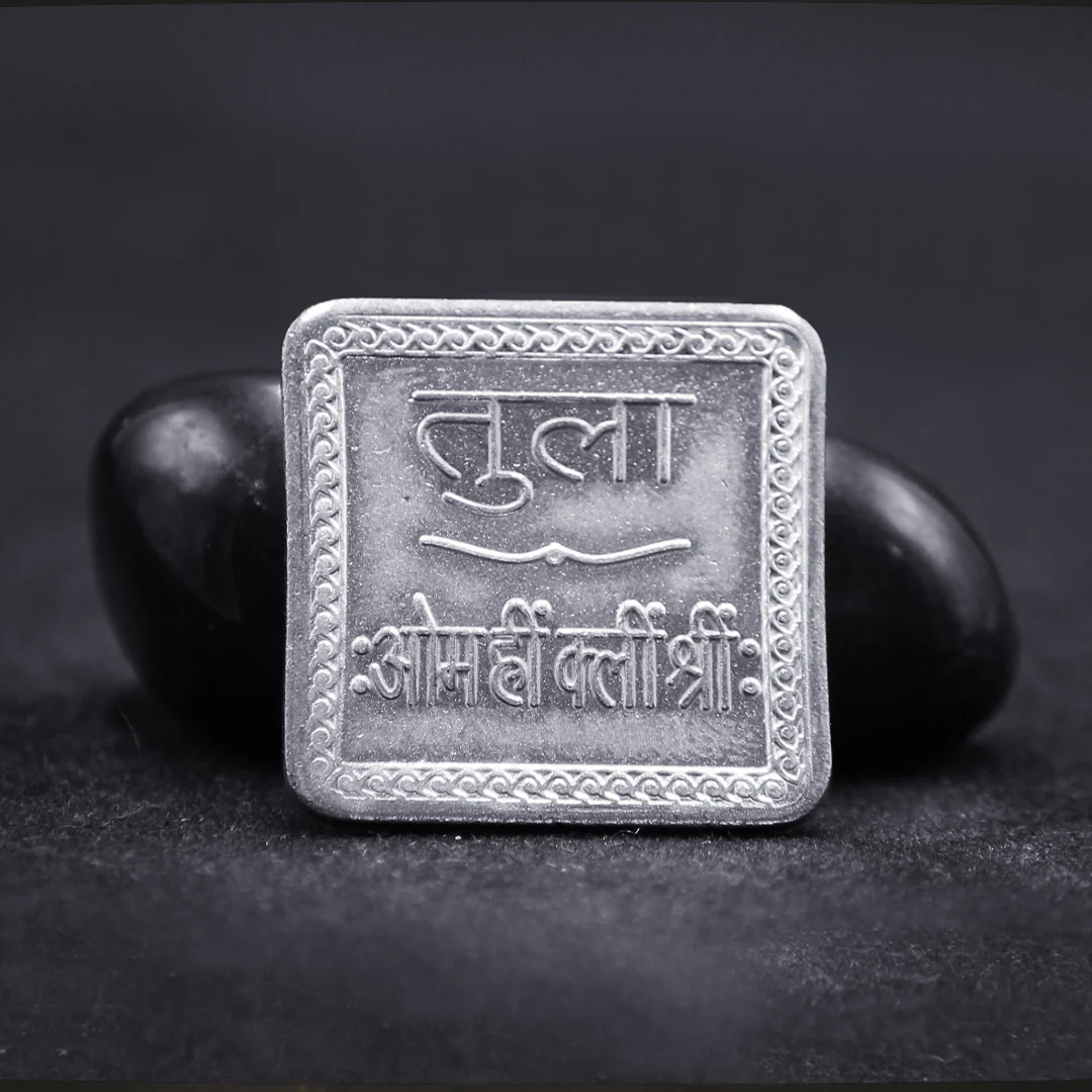 Tula Rashi Yantra Enhance your well-being with the Tula Rashi Yantra, crafted from Silver and available as a square coin with or without Kunda. Tailored for individuals born under the Libra sun sign, this yantra promotes good health, personal safety, and happiness in relationships. Key Benefits: 1. Improve Health: Provides relief from respiratory issues, headaches, stomach ailments, and skin disorders. 2. Prevent Accidents: Acts as a protective charm, shielding you from accidents and injuries. 3. Enhance Personal Happiness: Supports marital harmony, happiness, and boosts fertility. Craftsmanship Every Tula Rashi Yantra is beautifully crafted, reflecting the balance and harmony associated with Libra. Its elegant design makes it a valuable talisman and an attractive addition to your personal collection. Placement For best results, wear the yantra as a pendant or keep it in your personal space. It can also be placed on an altar to amplify its positive effects on your health and relationships. Conclusion Integrate the Tula Rashi Yantra into your life to foster health, safety, and happiness. With its meticulous craftsmanship and powerful qualities, this yantra helps you maintain balance and fulfillment in all aspects of life.
